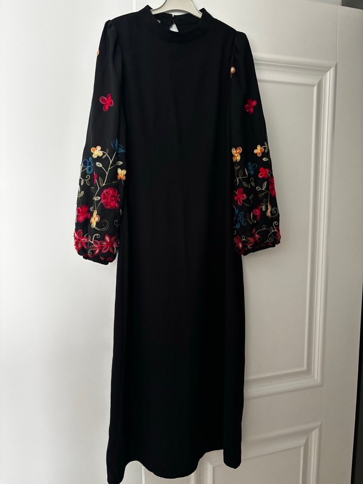 Renkli çiçek işlemeli uzun kollu, yüksek yakalı siyah elbise, bol kesim ve dökümlü tarzda, sentetik kumaştan, mütevazı ve bohem görünüme uygundur.