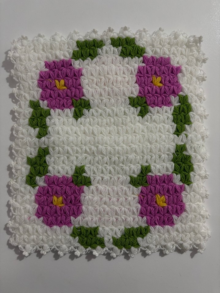 Mor çiçekler ve yeşil yapraklarla süslenmiş beyaz zemin üzerine el yapımı dantel.