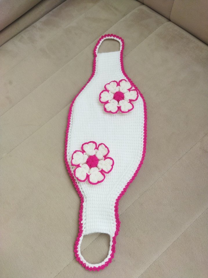 Renkli pembe kenarları ve çiçek motifleri olan beyaz banyo lifi i, cildi nazikçe temizlemek için tasarlanmıştır. İki ucunda tutma kulpları bulunur.