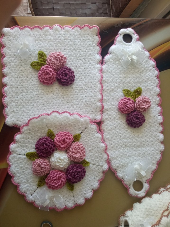 Pembe ve mor çiçek motifleri ile süslenmiş, pembe kenarlıklı beyaz el örgüsü 3 parçadan oluşan set. Her parçada narin kurdele detayları bulunur.