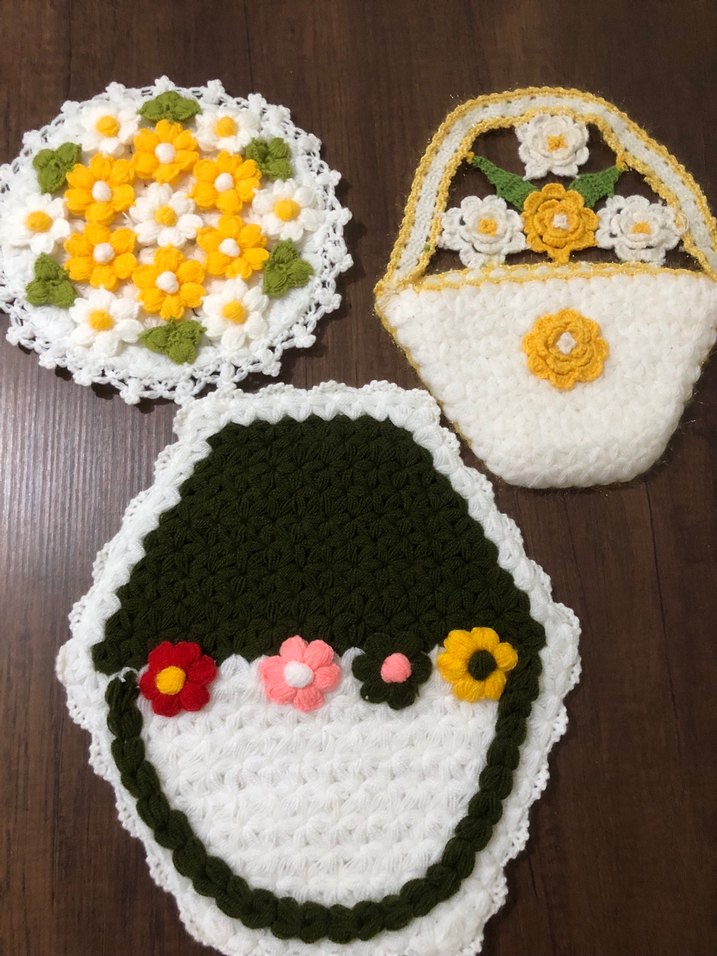 Beyaz, sarı, yeşil, kırmızı ve pembe iplikten yapılmış çiçek motifli el örgüsü dekoratif set. Yumuşak dokulu ve renkli tasarımlar mekanlara şıklık katar. Adet fiyatı