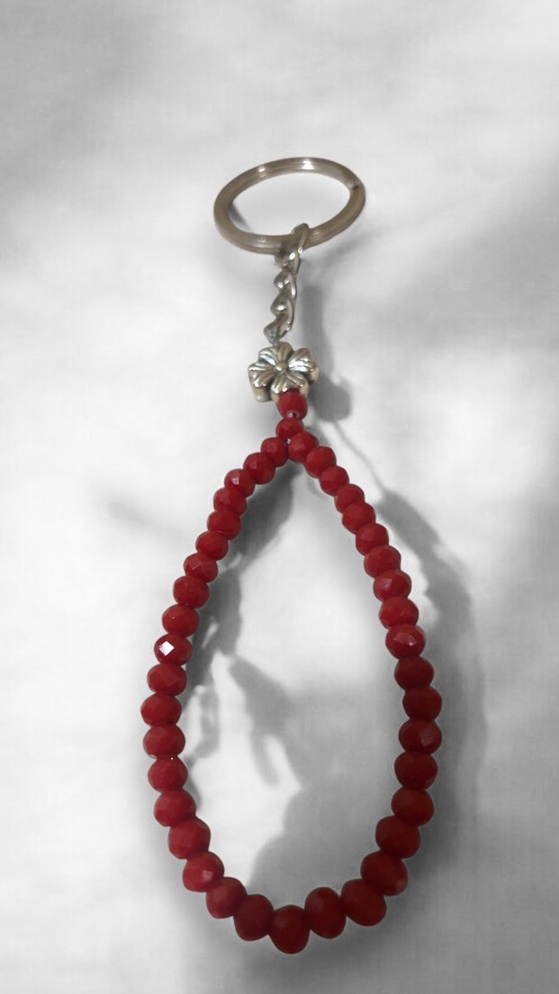 Kırmızı boncuklardan oluşan, minimalist bohem tarzında anahtarlık, metal çiçek halka ile zarif bir dokunuşa sahip