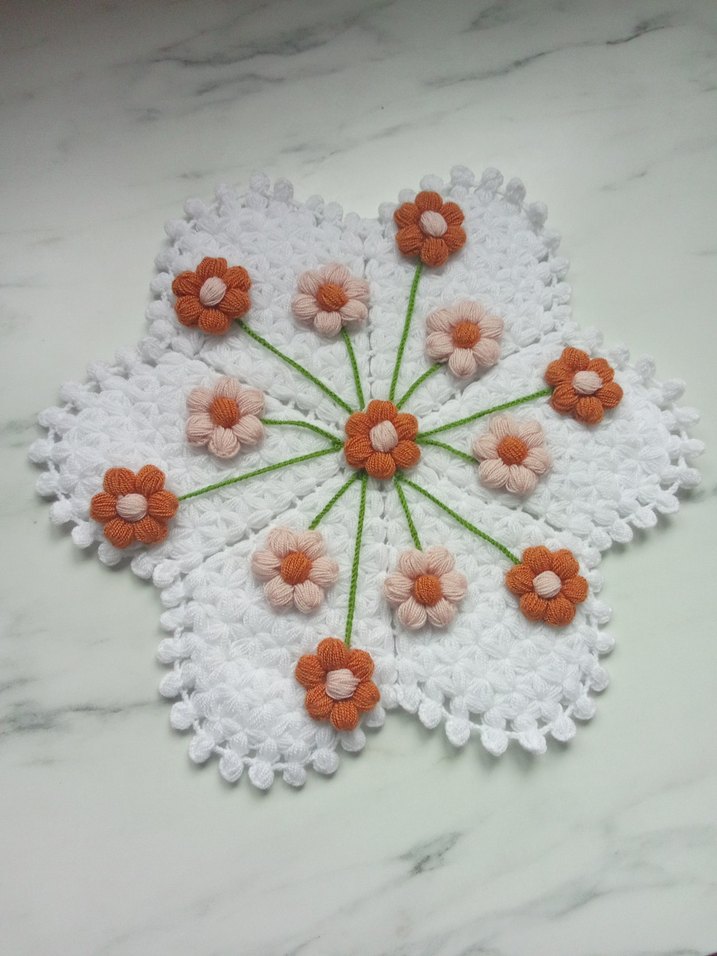 Beyaz tabanlı, turuncu-pembe çiçek motifleri ve yeşil detaylı lif