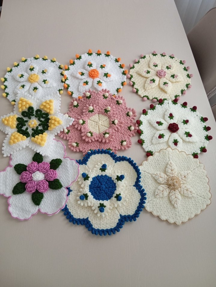 Farklı renklerde çiçek motifli, el yapımı örgü lif