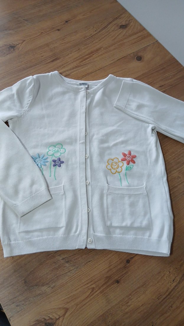 Pastel renklerde çiçek nakışlı, düğmeli, uzun kollu beyaz kız hırka
