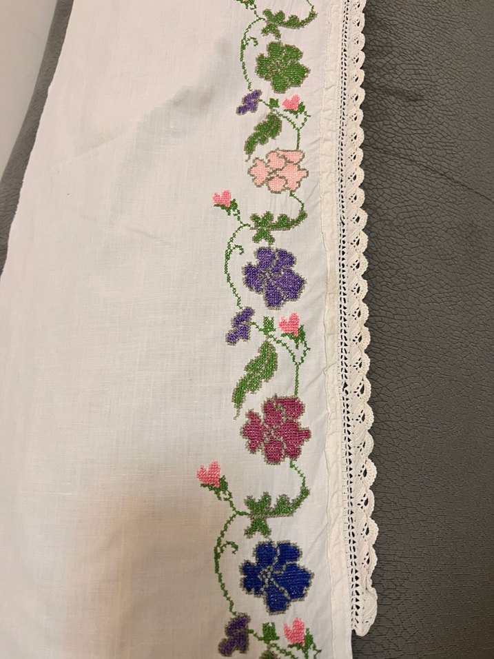Mor, pembe ve yeşil detaylı çiçek nakışlı, dantel kenarlı kumaş. Kaneviçe. Kumaşı yıpranmış. Motif örnek çıkarılabilir. Ben tel dolap içinde kullandım.