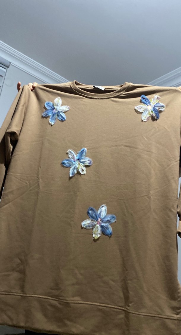 Uzun kollu, yuvarlak yakalı, düğmeli ve çiçek nakışlı kahverengi tişörtü, rahat kesim ve gündelik stil için uygun.
