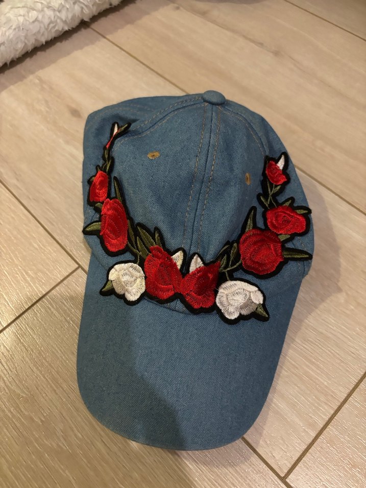 Renkli çiçek nakışlı, düğmeli mavi kot kadın şapkası, bohem ve retro sokak stiline uygun.