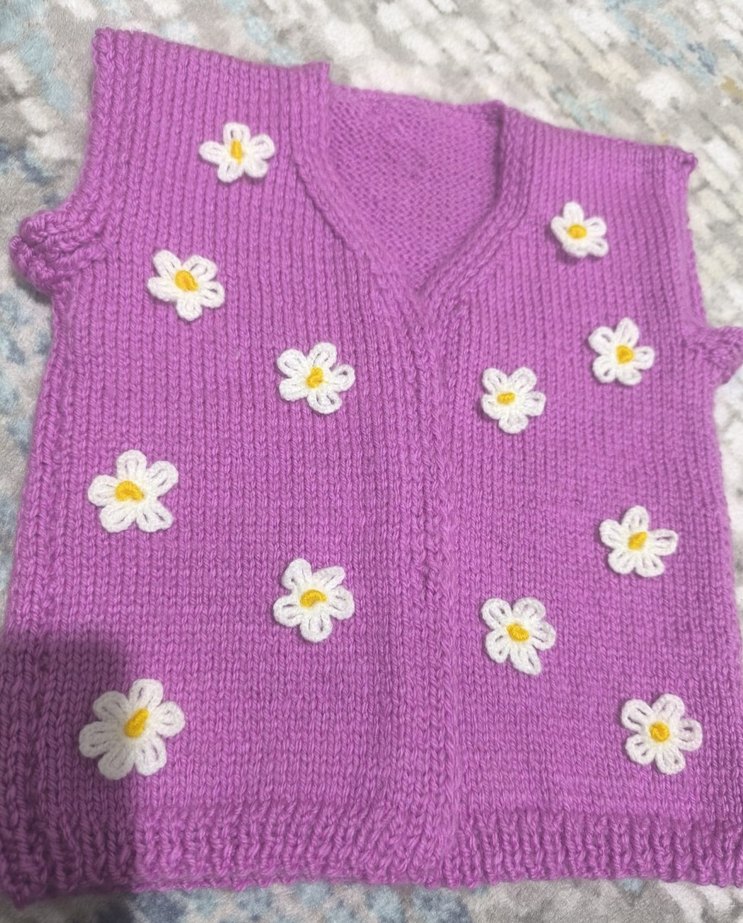 Mor renkli, çiçek nakışlı, kolsuz örgü süveter. Bol kesimi ve bohem tarzı ile dikkat çekiyor.1 buçuk 2. yaşlarındaki bebekler içindir. İstiyene işlenir, sipariş alınır.