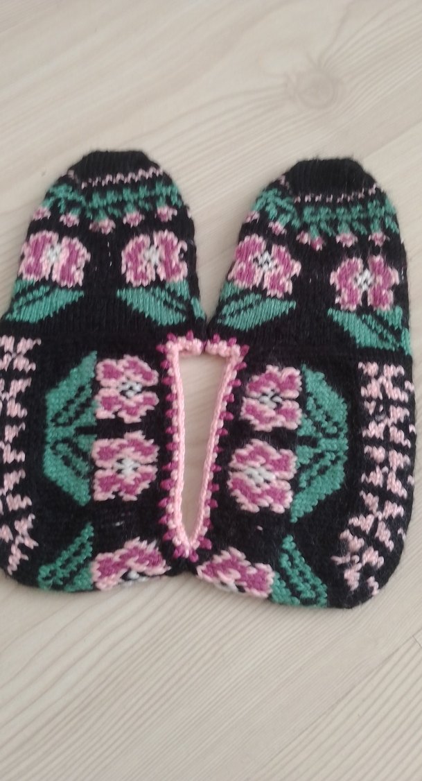 Çiçek nakışlı, koyu renkli çok renkli örgü kadın terlikler. Wedge topuklu, rahat ve bohem tarzda.