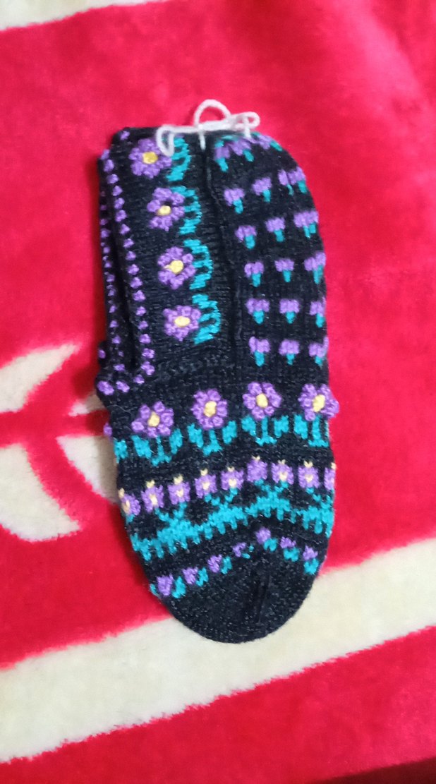 Siyah zemin üzerine mor ve turkuaz çiçek nakışlı, renkli kız çorabı.
