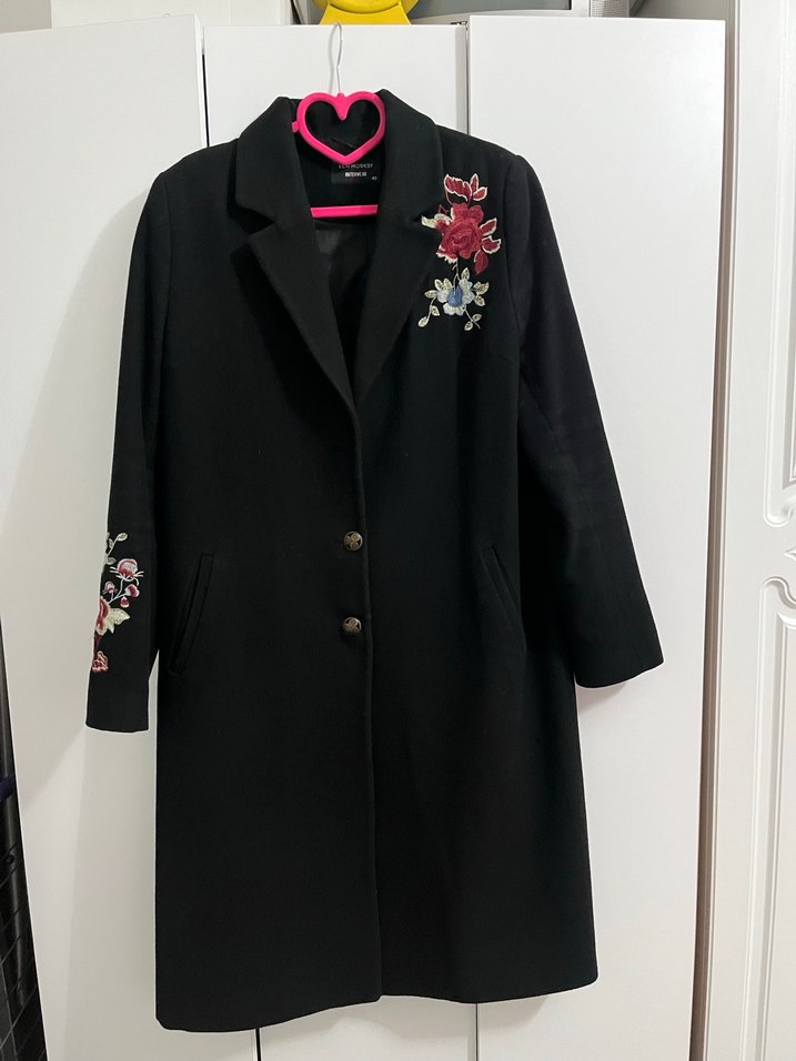 Göğüs ve kol kısmında çiçek nakışları bulunan siyah kaban, klasik yaka ve düğmeli kapamaya sahiptir. Şık ve zarif bir görünüme sahiptir. Boy 107