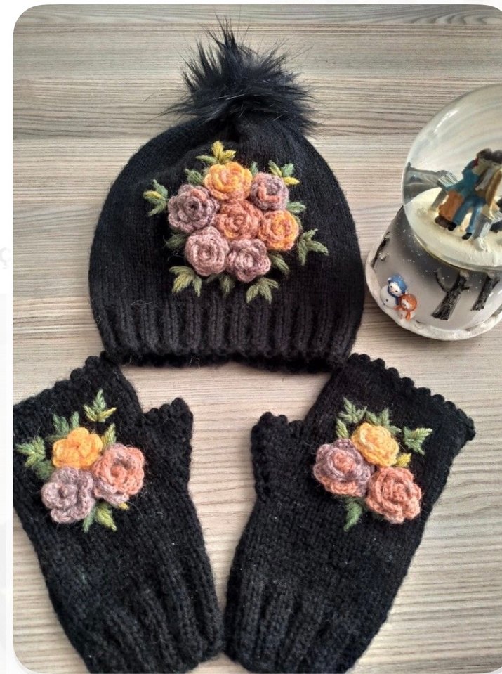 Çiçek Nakışlı Siyah Örgü Eldiven ve Bere Seti