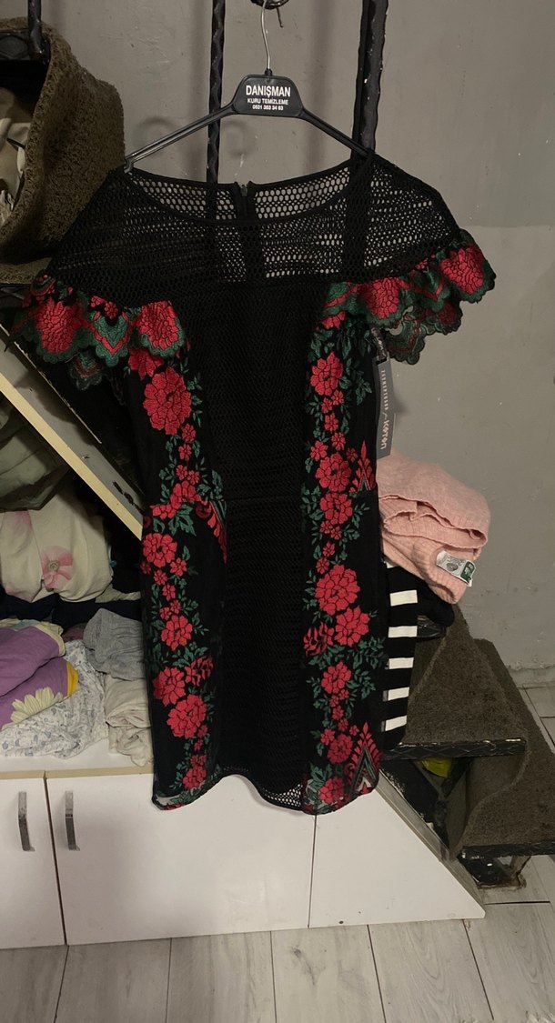 Çiçek nakışlı dantel detaylı, straplez ve askılı kollu, bohem tarzda, normal boy midi elbise. Romantik akşamlar için ideal.