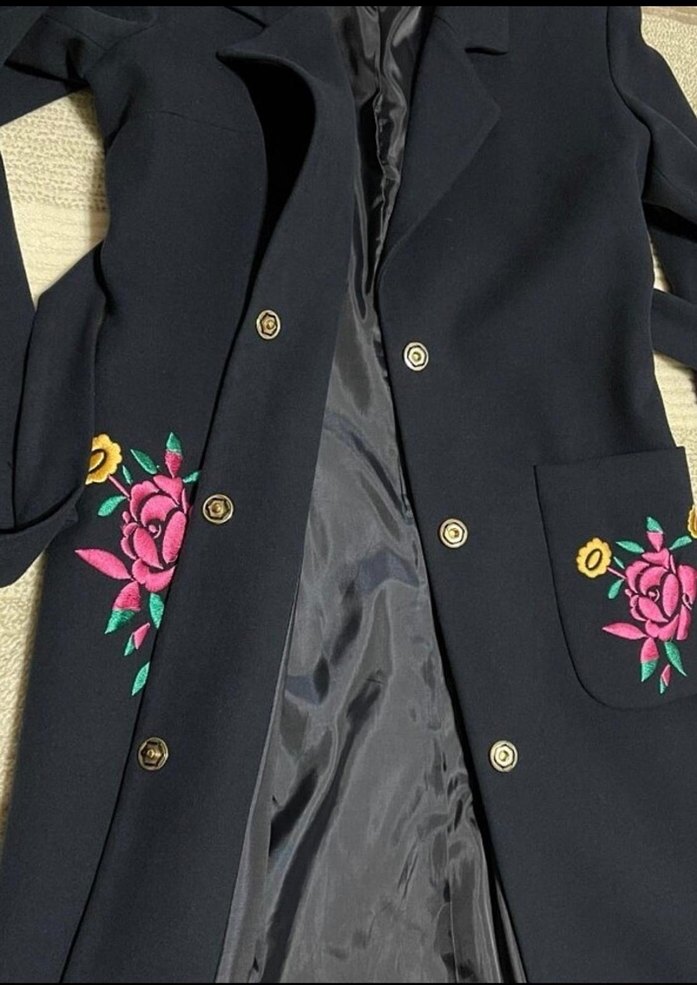 Kadın blazer, yaka kısmı kesik ve düğmeli, cepler ve kollarında renkli çiçek nakışları vardır. Uzun kesim, regular fit ve koyu sentetik kumaştan, günlük kullanım için uygundur.