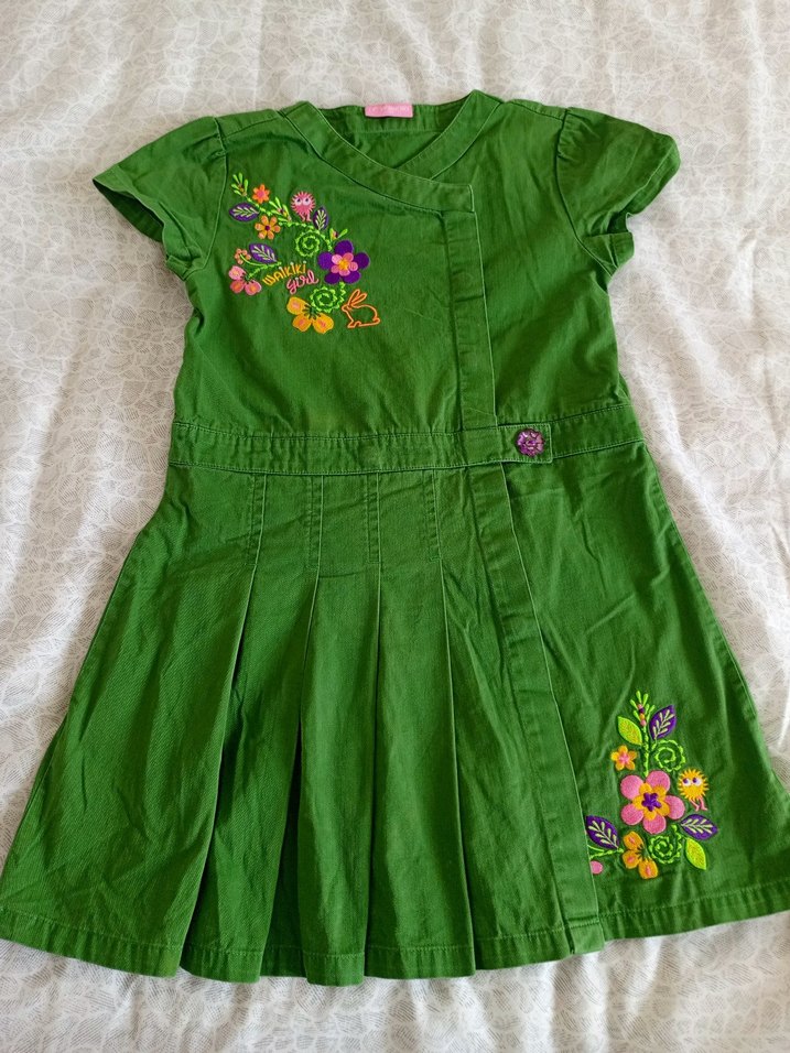 Renkli çiçek nakışlı, kısa kollu yeşil kız elbisesi. Düğmeli, bol kesim ve yumuşak dokulu kumaştan yapılmıştır.
