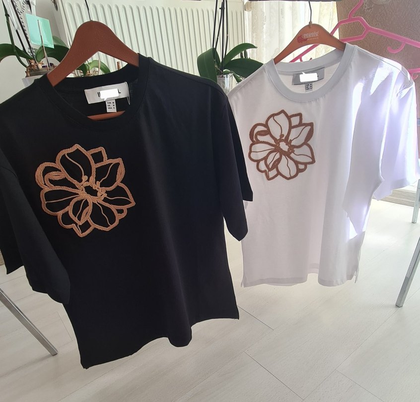 pamuklu kısa kollu tişört, önünde nakisliçiçek deseniyle. Salaş kesim, yuvarlak yaka ve kısa boyda, rahat sokak stili için uygundur.