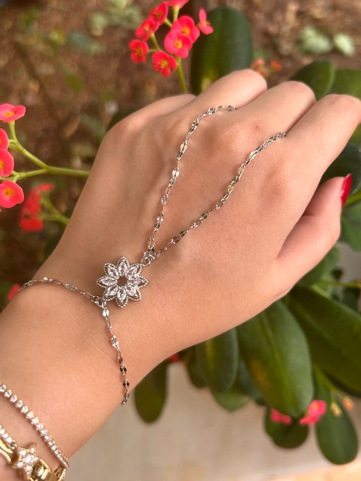 Diger markasının beyaz çiçek desenli, detaylı zincirli bohem tarzda el aksesuarı, düğün ve retro stiller için uygundur.