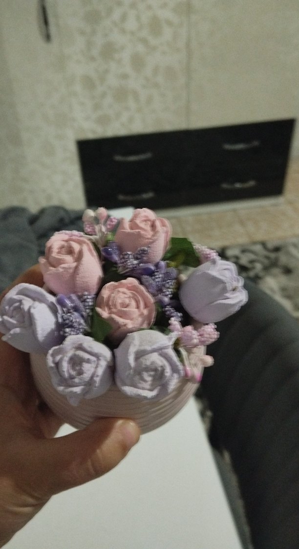 Yumuşak pembe ve lavanta tonlarında çiçek şeklinde dekoratif kokulu taş, küçük beyaz bir kapta düzenlenmiş.