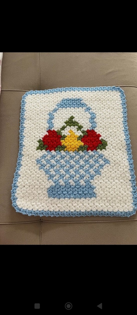 Çiçek sepeti desenli, açık mavi kenarlı, kırmızı, sarı ve yeşil renklerde çok renkli el yapımı banyo süngeri.