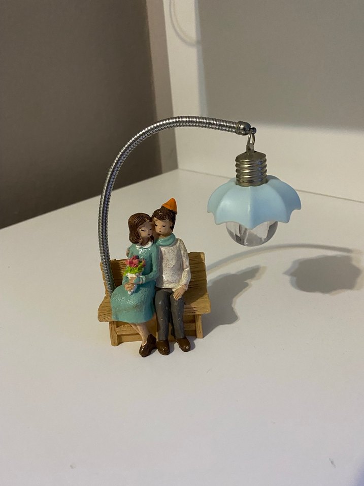 Bej ve açık renklerde, bankta oturan çifti gösteren küçük mavi lambalı figürin. Lambasını çalıştıramadım biblo olarak kullanılabilir