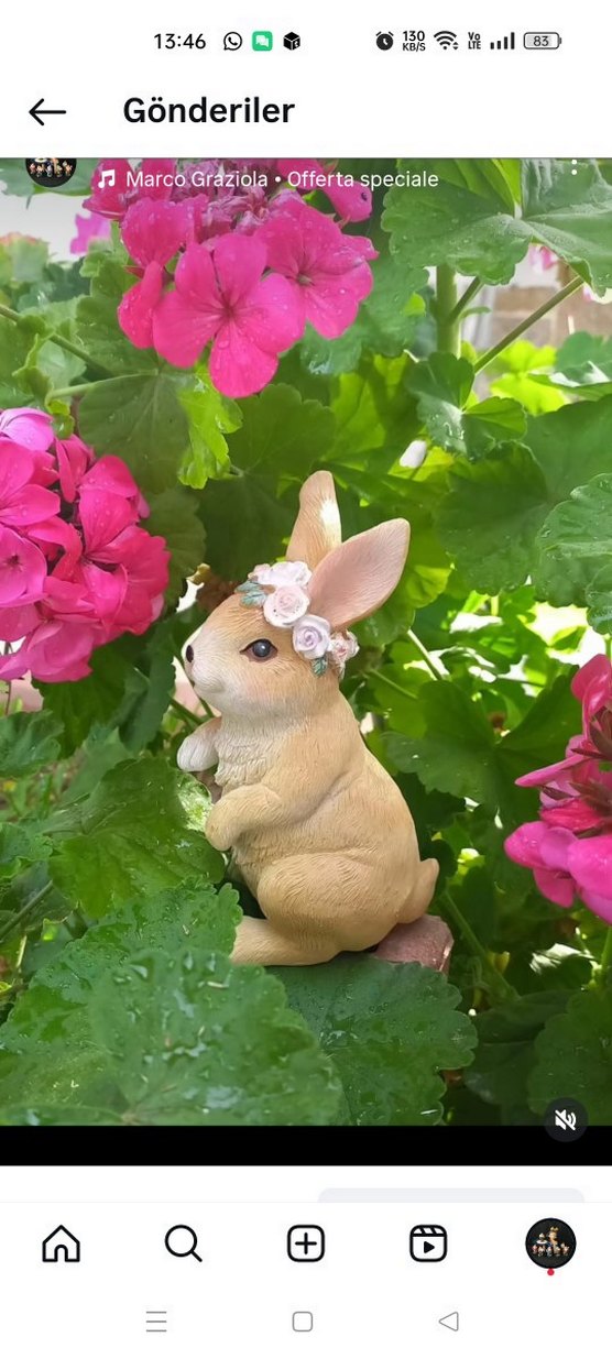 Pastel çiçek tacıyla süslenmiş bej renkte tavşan biblosu, canlı yeşil yapraklar ve pembe çiçekler arasında oturuyor.