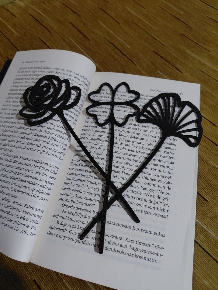 Gül, yonca ve yelpaze şeklinde siyah metalden yapılmış üç kitap ayracı seti. Kitaplarınızda sayfa işaretlemek için kullanışlıdır.