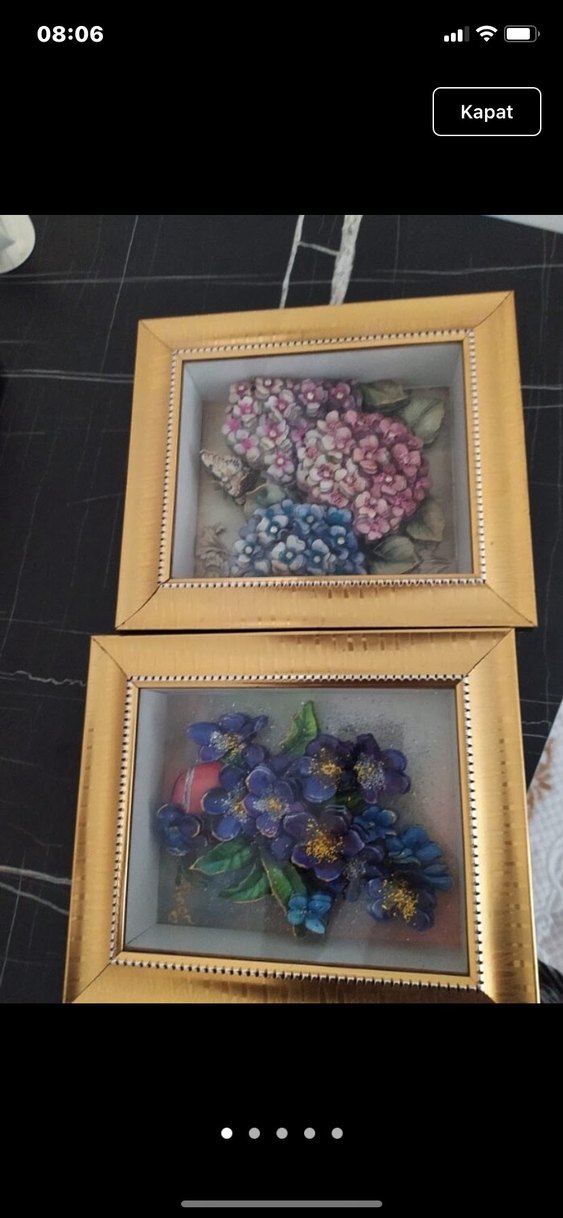 Altın renkli çerçevelerde, kabartmalı ve canlı renklerde iki çiçek temalı tablo seti. Mor, pembe ve mavi tonlarında detaylı çiçekler yer alır.