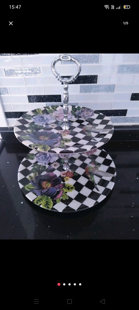 Gümüş saplı, çiçek ve damalı desenli, koyu ve canlı renklerde iki katlı servis tabağı. gümüş kısımlar plastiktir.