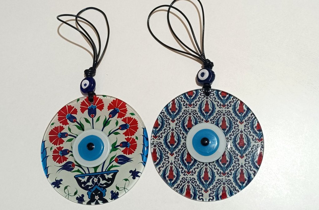 Çiçek ve geometrik desenlerle süslenmiş, ortasında mavi nazar boncuğu bulunan renkli dekoratif asma süsler.