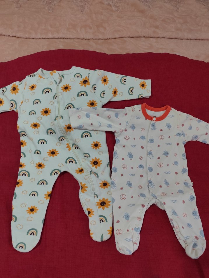 Yumuşak kumaştan yapılmış, ayçiçeği ve gökkuşağı desenli renkli bebek tulumları. Rahat kullanım sağlar.