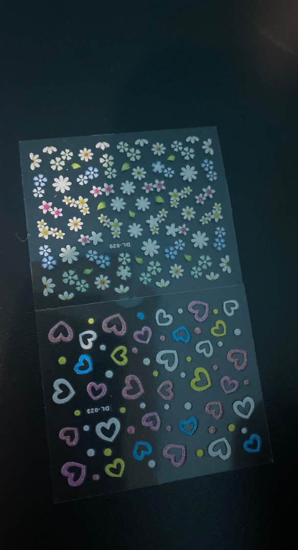 Çiçek ve kalp desenli çok renkli, koyu tonlarda tırnak süslemeleri. Küçük çiçek ve kalp figürleri içerir.