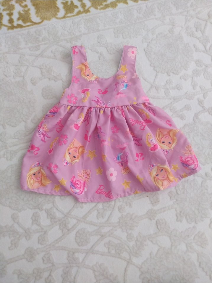 Pembe, kolsuz, bol kesim kız çocuk elbisesi. Fırfır detaylı ve askısız yaka tasarımına sahip, pastel tonlarda tie-dye desenli. sıfır ürün 1 yaşa kadar olur