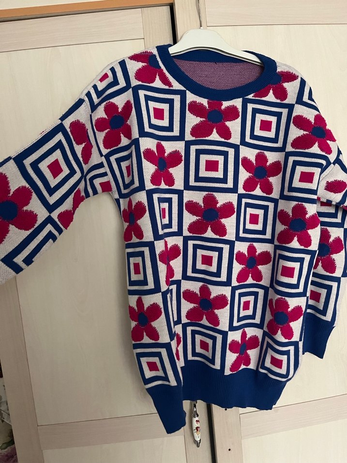 Renkli, çiçek ve kare desenli, uzun kollu, yuvarlak yakalı, bol kesim kadın triko kazak. Rahat ve bohem tarz için uygun.