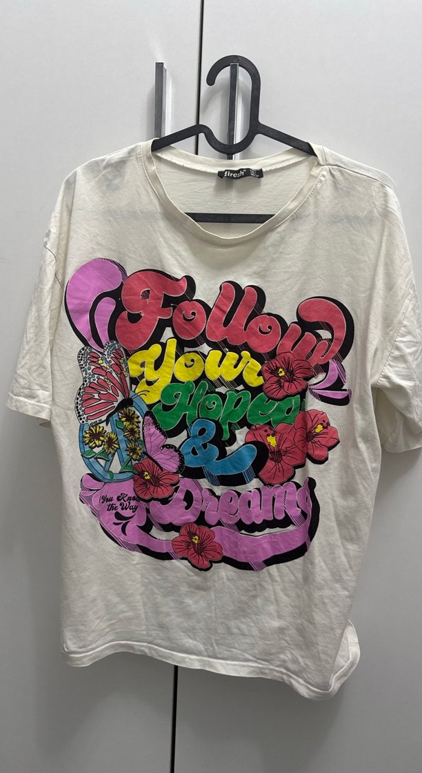 Pamuklu, kısa kollu, yuvarlak yaka, bol kesim tişört. Renkli çiçek ve kelebek baskılarıyla sokak stiline uygun.