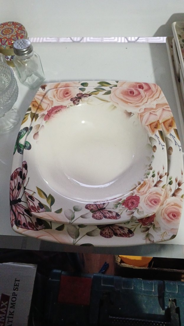 Çiçek ve kelebek desenlerine sahip, yuvarlak iç kısmı olan kare beyaz tabak. ️