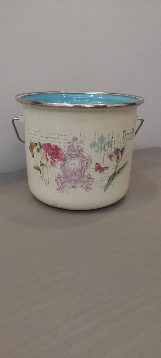 Beyaz emaye kova, pastel çiçek ve kelebek desenleri ile mavi iç yüzeye ve metal kulplara sahiptir. Hem dekoratif hem kullanışlıdır. 4 litre su tam alıyo görsellerde mevcuttur.