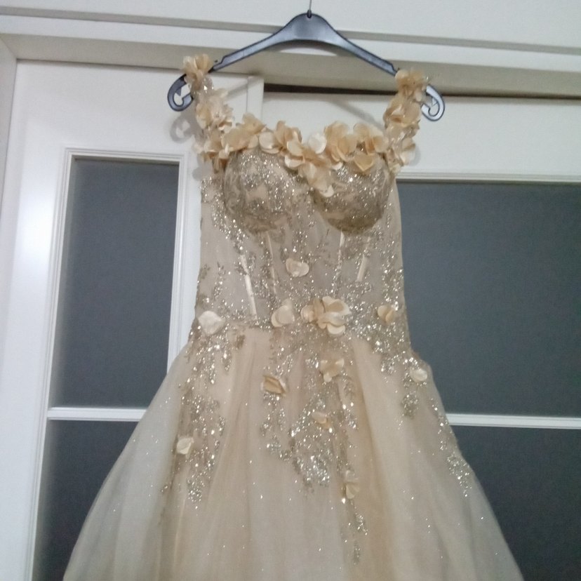 Uzun Gold gelinlik, straplez yakada ve etekte çiçek detayları ile süslenmiş, vücuda oturan ve ışıltılı işlemelere sahip. Bohem ve göz alıcı tasarım. Bir kez giyildi . Iki kol arası 41cm BEL 40cm. BOY 150cm