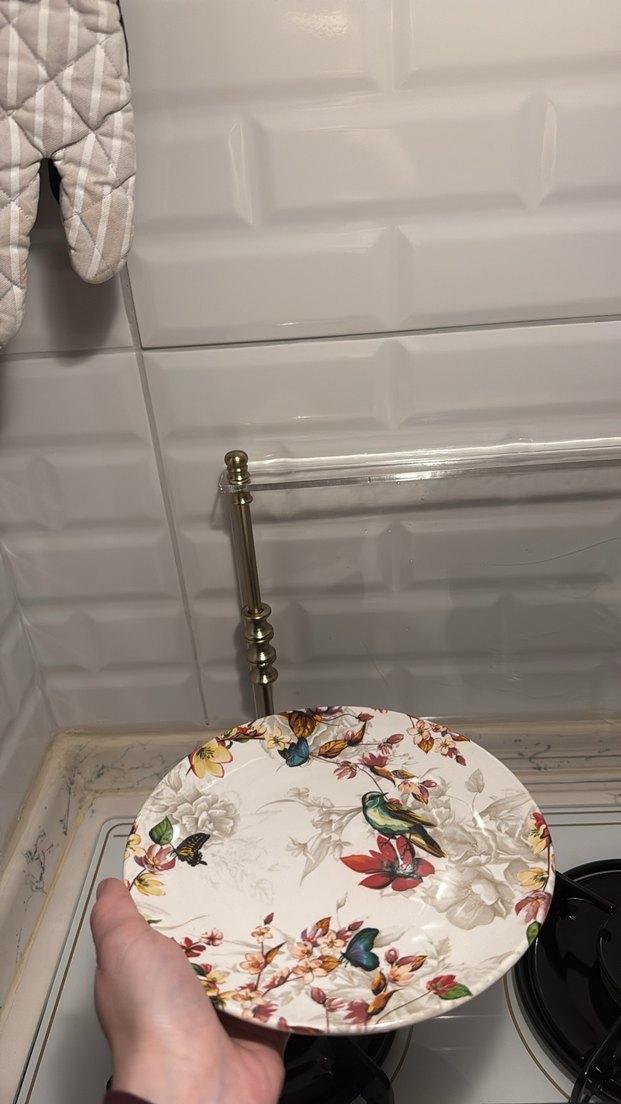 Çiçek ve kuş desenli, çok renkli ve açık renkli bir tabaktır. Yemek servisi için uygundur. ️