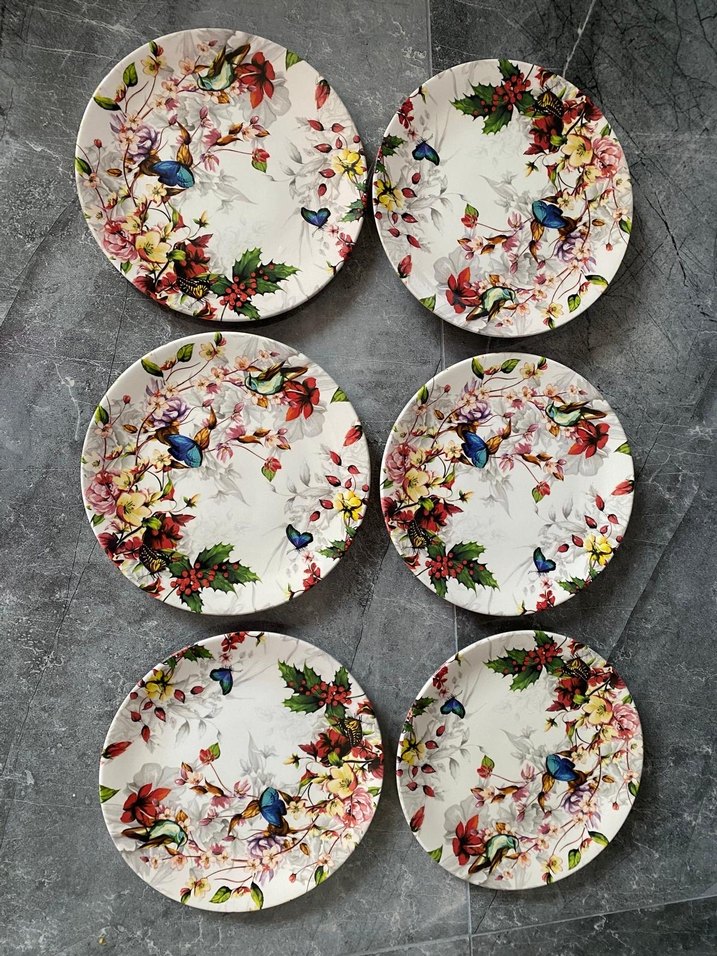 Altı parçadan oluşan, çiçek ve kuş desenli, çok renkli ve hafif canlı tabak seti. Yemek servisine şık bir dokunuş sağlar. ️