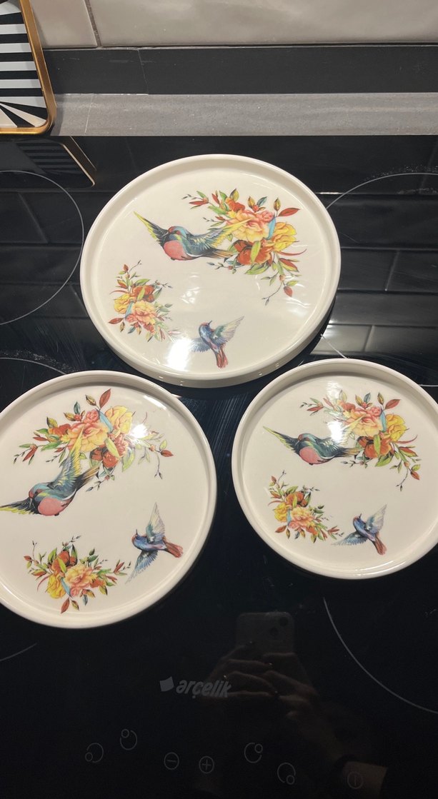 Çiçek ve kuş desenleriyle süslenmiş, vintage tarzı çok renkli ve açık tonlarda tabak seti. Sofranıza klasik bir dokunuş katmak için ideal. ️
