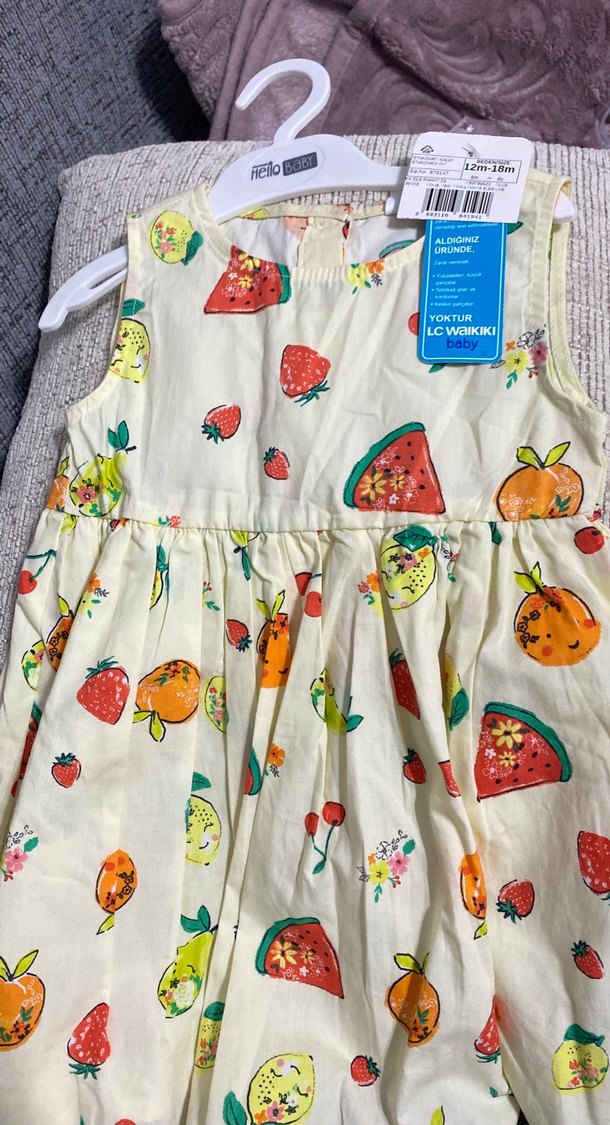 Çiçek ve meyve desenli, kolsuz, straplez, bol kesim kız çocuk elbisesi, yumuşak sentetik kumaştan ve fırfır detaylıdır.