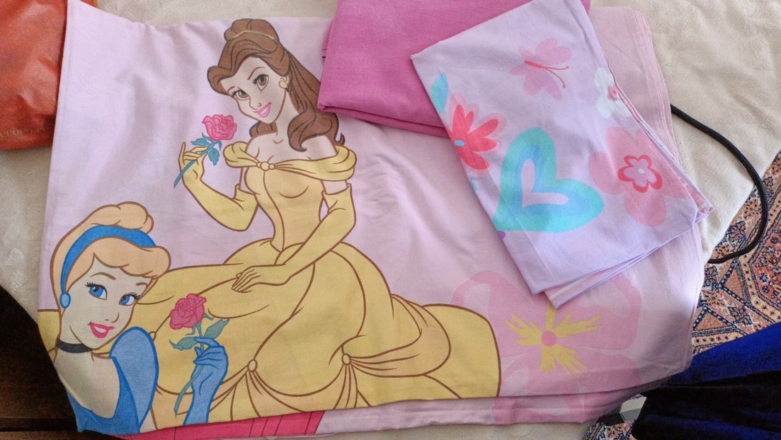 Pamuklu kumaştan yapılmış, pembe pastel tonlarda, prenses ve çiçek desenli çocuk nevresim takımı.Fotoda paylaştığım mürekkep lekesi var bir kenarında.