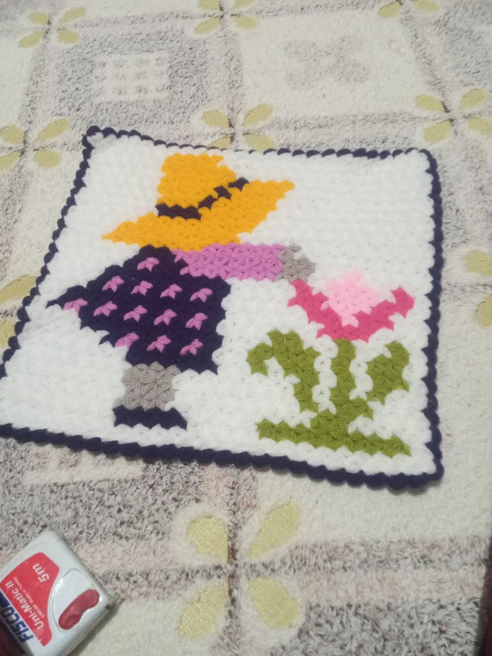 Sarı şapkalı figür ve çiçek desenli, yumuşak dokulu renkli banyo lifi.