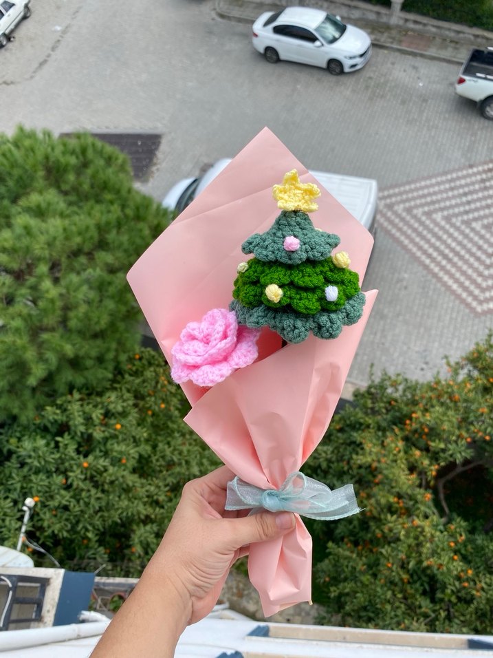 Bohem tarzda el örgüsü yılbaşı ağacı ve pembe çiçek Çam kokuludur. İstenilen renklerde örülür.