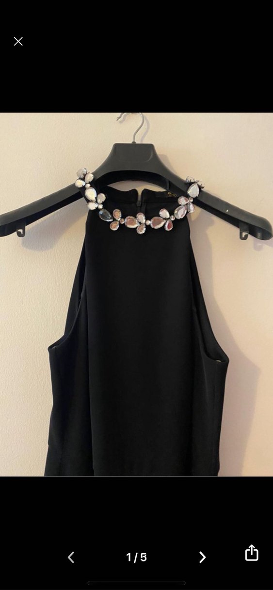 Zincir detaylı yüksek yakalı, siyah uzun abiye elbise. Kolsuz ve baskılı desene sahip, şık parti kombinleri için uygun.