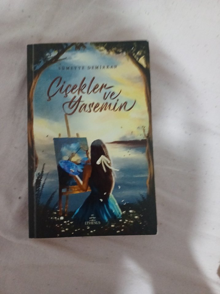 "Çiçekler ve Yasemin" romanı, gün batımında deniz kenarında resim yapan bir kızı gösteren kapak illüstrasyonuna sahiptir.