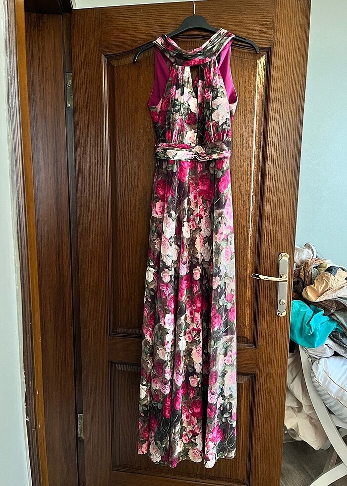 Çiçekli uzun abiye, boyun kısmı arkadan bağlamalı uzun ipi mevcut. Sadece bir kere giyildi.
