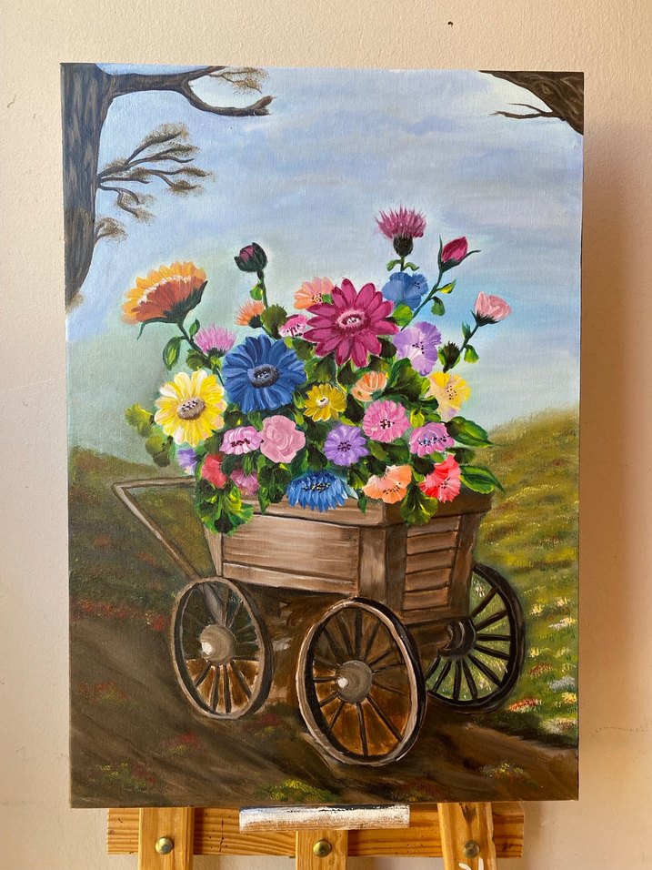 Doğal bir manzara önünde, rengarenk çiçeklerle dolu ahşap bir arabayı betimleyen canlı Akrilik boya tablo. Kendi çalışmam