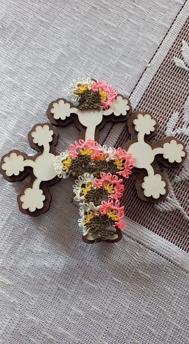 Ahşap nakış askısı, pembe, sarı ve yeşil tonlarda ince çiçekli iğne oyası ile süslenmiş, geleneksel el sanatlarına uygun.